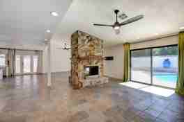 Rare and distinctive 3-bedroom, 2-bath home with a spacious open layout, perfect for comfortable living and entertaining. The large living area features a stunning floor-to-ceiling stone wood-burning fireplace, creating a warm focal point for the home.