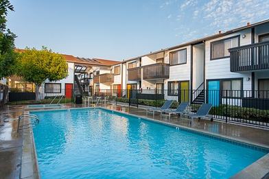 This Costa Mesa apartment is as hip and trendy as any building one might find in Hollywood or Downtown LA. The interiors feature quartz countertops, high-gloss white cabinetry, stylish vinyl plank flooring, designer faucets and fixtures, and eye catching paint schemes. The property boasts 2 pools and 2 spas, lounge areas and BBQs with a mix of individual garages and open parking.