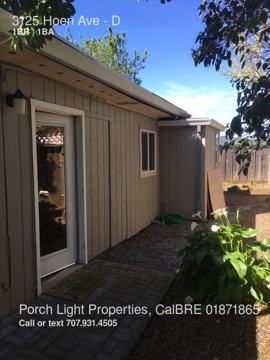 Enjoy living in a house like setting. This is the end unit of a triplex with only one partially shared wall in living area. The private yard wraps around the unit and is almost as big as the unit itself. There is a sunny patio off of the bedroom. The laminate flooring flows throughout the unit. Bathroom has a shower, no tub. Laundry is shared by the 4 units on the property. There is one dedicated covered parking space and additional guest parking. Be close to shopping at Montgomery Village, and a few minutes from Annadel State Park. Easy commute to Hwy 12/101 interchange.This is a long term month-to-month tenancy, with a security deposit required. A dog under 25lbs. and up to 2 cats will be considered and will increase the deposit by $100 per pet. Utilities are paid by the tenant except for water/sewer. The owner is not accepting cosigners at this time. Please drive by, but DO NOT DISTURB OCCUPANTS. Also, take a look at the Rental Qualifications under the Rental Application Information tab on our website: www.callporchlight.com. Then call (707) 931-4505 to make an appointment to view. Apply online after viewing the property.