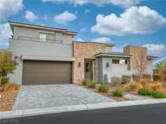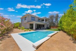 Welcome to 2 Sugarberry, a luxurious contemporary estate on a quarter acre in the prestigious guard-gated community of The Ridges in Summerlin. Offering over 3,500 sq ft with 3 bedrooms plus den/office, 4 baths, and a 3 bay garage. Enjoy direct access to the Jack Nicklaus-inspired Bears Best Golf Course and world-class amenities: complete fitness center, multiple pools, spas, tennis, pickleball, community activities. The residence boasts a sparkling private pool, 20-foot ceilings, porcelain tile floors, linear fireplace, wet bar. Chefs gourmet kitchen has quartz counters, stainless steel appliances, and walk-in pantry. The expansive primary suite occupies the entire upper level, featuring 2 private balconies, a den/office, and spa-inspired bathroom with a digital rain shower, free-standing tub, dual vanities, large walk-in closet. 2 spacious guest rooms each have full bathrooms. The backyard is an entertainer's oasis with covered patio, lush green landscape and fruit trees.