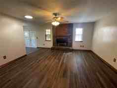 The living room boasts new luxury vinyl plank flooring, updated light fixtures, and a cozy brick fireplace with hearth, mantel, and cedar accent trim. All bedrooms include brand-new carpet, and both bathrooms offer ceramic tile, porcelain fixtures, and a tub/shower combination.