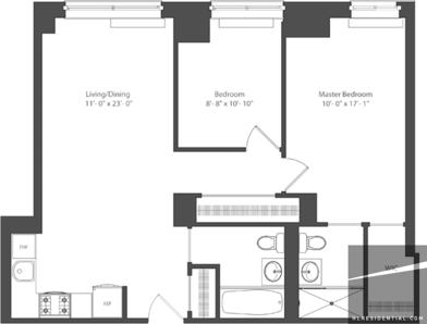 This spacious, no fee, 2 bedroom, 2 bath apartment has a walk-in closet in the master en suite, high ceilings, floor-to-ceiling windows, high end finishes and 24 hour doorman has a bright, open, airy feel. Priced right for a full service building.