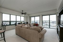One of the favorite plans. Largest balcony overlooking the fairways, Granite counters.. Two full baths. Very large rooms. Dining room, den. 24 hour doorman, Secured heated parking. 9' foot ceilings. Corner unit facing south east. Walk to restaurants, gym, theater. Gorgeous views. 1 heated garage parking and 1 assigned outside.