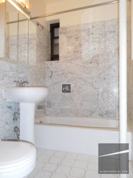 The recently renovated bathroom has a standard tub, good storage, a medicine cabinet, and a standard shower.