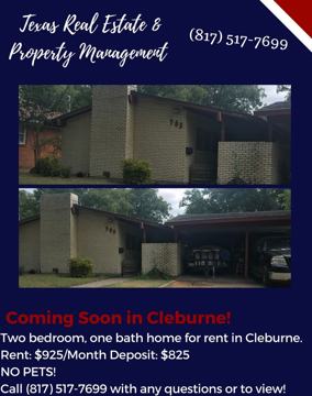 Coming soon! Two bedroom, brick home in Cleburne. Large floorplan, two car carport and a fenced backyard! NO PETS!