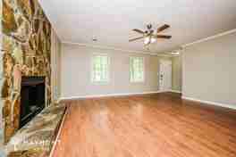 Inside, the living room immediately draws attention with its wide layout, LVP flooring, and a striking stone centerpiece that serves as a natural focal point. The open flow leads into the dining area and kitchen, where generous cabinetry and updated appliances, including a new dishwasher, range, and refrigerator to create a space that’s both functional and easy to navigate. Natural light from multiple windows adds to the inviting feel throughout the main living areas.