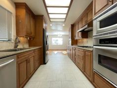 An updated kitchen features, premium cabinets, granite counter tops, gas stove top, fridge, dishwasher and double oven.