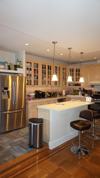 Living room opens up into opens up to a completely renovated kitchen area via breakfast bar w/ light pendants.