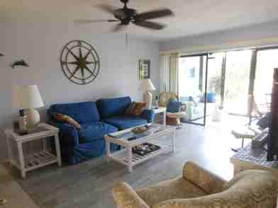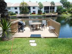 MINIMUM 14 NIGHT STAY. Looking for a fully furnished condo with a beach feel and awesome views? Well this fully furnished two bedroom twobathroom beach theme condo is just right. Large living area with seating for all to enjoy the flat screen television. Living room over looks the pond from your Screen Patio with air conditioning and separate deck with Teak furniture and grill. Cook your favorite meals in this lovely kitchen and enjoy it in your dining room seating for 4. Master bedroom features a King size bed, master bathroom and tile floors. Second bedroom features a Full size bed and Berber carpeting. WiFi, Washer/Dryer, BasicCable, Beach Towels & Chairs are included.