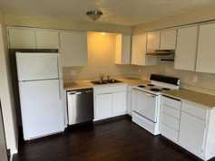 Kitchen has freshly painted cabinets and a stainless dishwasher!