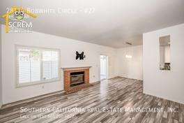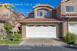 This beautifully designed three-bedroom townhome in Saugus features an inviting entryway that leads into a living room with wood laminate flooring, plantation shutters, and a charming brick fireplace. The dining area also features wood laminate flooring and is enhanced by a designer light fixture and a sliding glass door that opens onto a spacious, private fenced patio. The kitchen is equipped with white cabinets complemented by brushed-silver hardware, granite countertops with a designer glass-tile backsplash, and stainless-steel appliances, including a gas stove with a double oven, a microwave, a dishwasher, and a refrigerator. A door from the kitchen provides access to the attached two-car garage, which includes built-in storage cabinets, overhead storage, a folding workbench, and a full-size washer and dryer. A convenient half bathroom is located off the living room and features a quartz stone countertop with a vessel sink. Upstairs, there are two guest bedrooms, both with laminate flooring. The guest bathroom features a quartz stone countertop, vessel sinks, and touch-screen vanity mirrors. The spacious primary bedroom has vaulted ceilings and a walk-in closet, while the attached bathroom also includes a quartz stone countertop, a vessel sink, and a touch-screen vanity mirror. Enjoy the community HOA pool and spa. Conveniently located to shopping and restaurants. *Owner may consider a small pet.