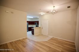 Brand new laminate Wood/Ceramic tile floors throughout the whole unit. This End Unit 3/2 condo also includes a screened lanai that overlooks a quiet wooded area for your privacy. There is a spacious kitchen with appliances including a new refrigerator, washer/new dryer, 2 pantries and plenty of cabinetry. Living/dining room combo. The Master suite has a large walk-in closet. Across the street there is an amenity center that includes a pool and a playground. The property is close to I-295, shops and groceries. This Ground floor condo is located in a Secure Gated Community.