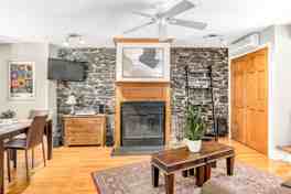 Ce logement spacieux est situé au rez-de-chaussée. Il exhale un charme chaleureux de style chalet, avec un foyer à manteau de bois et des murs en pierre apparente.