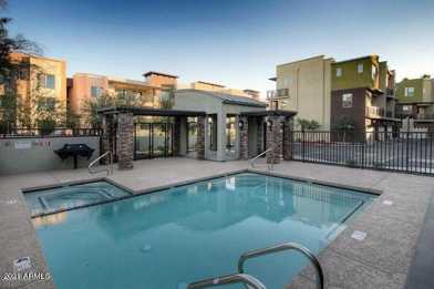 Contemporary 3-level townhome in the desirable Trio Condominium community, minutes from Scottsdale Fashion Square and Old Town Scottsdale. The main living level features a bright open floor plan with a spacious great room, Isokern fireplace, and kitchen with granite countertops and stainless appliances. The top-level loft-style primary suite includes an attached bath with dual vanity and a tiled shower. The entry level offers a flexible secondary room suitable for a home office, guest space, or additional bedroom. Attached 2-car garage, in-unit washer and dryer, and community pool access included. Unfurnished. Ample street parking. Convenient Scottsdale location near shopping, dining, entertainment and major routes.