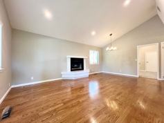 Inside, the home features hardwood floors, cozy carpeted bedrooms, and central forced heat. Vaulted ceilings and a gas fireplace create an inviting atmosphere, perfect for relaxing or entertaining. The kitchen is thoughtfully updated with a subway tile backsplash, quartz countertops, generous cabinet space, and stainless steel appliances, including a refrigerator, dishwasher, and gas range. A dedicated in-unit laundry room with a washer and dryer adds everyday convenience.