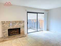 The living room features a cozy fireplace and tile flooring, while the large kitchen includes granite countertops, maple cabinetry, and appliances like stove, microwave, refrigerator, and dishwasher. A washer and dryer are also conveniently located inside the unit.