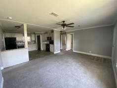 The living room is bright with lots of windows that opens to the dine in kitchen with lots of cabinet space separated by a pony wall with pillar.