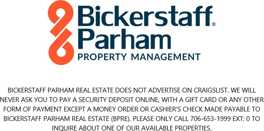 Bickerstaff Parham Real Estate does NOT advertise on. We will never ask you to pay a security deposit online, with a gift card or any other form of payment except a money order or cashier's check made payable to Bickerstaff Parham Real Estate.