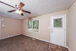 The main level opens to a spacious living room finished with carpeted flooring and large windows that bring in natural light. Just beyond, an additional sitting area offers flexible use and connects easily to the kitchen and dining space. The kitchen features white cabinetry, laminate countertops, tile flooring, and a full appliance package, with a practical layout that keeps prep and storage within easy reach.