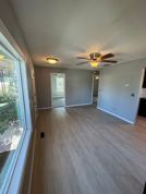 Plank flooring in both living room areas, kitchen, dining room and hallways.
