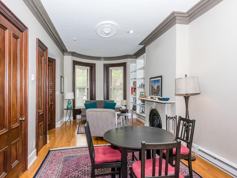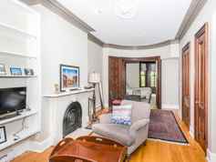 Prime South End location. Elegant and sunny one bedroom, with soaring ceilings and gracious bow front windows. This parlor-level home is close to everything the Back Bay and South End have to offer. A large living room is highlighted by a beautiful, decorative-only marble mantled fireplace and large windows with city views, and a nice sized living-dining area. The recently updated galley kitchen has many cabinets for storage. A good-sized bedroom features a bay window with a door leading to a nice, private deck overlooking tranquil Dartmouth Place. Home has multiple closets, a recently renovated bathroom and in-unit laundry. No pets, no smoking. Window air conditioning.