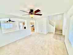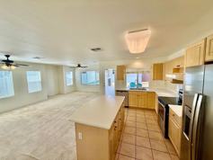 Step inside to find a large living area with multiple ceiling fans, plenty of natural light, and freshly cleaned carpet throughout. The open-concept kitchen features an island, stainless steel appliances, and ample cabinet space, flowing seamlessly into the dining and family room areas.