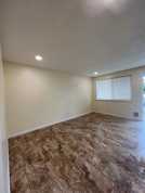 A triplex house has an upper unit available for lease. The 750 sqft unit has a big living room with an open floor plan, connecting the dining room and kitchen with a new floor LVL installed.