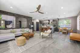 The interior palette is rooted in nature. Expansive large-format porcelain tile — laid in a seamless concrete-like finish — flows throughout the main living areas, delivering clean, cool undertones that anchor the space. Against this backdrop, natural driftwood elements are woven throughout: marble kitchen countertop, hand-selected accent pieces, floating shelving, custom furniture and architectural details that introduce warmth, texture, and the unhurried beauty of weathered organic form.