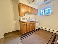 1 bedroom Ground Level apartment located steps from the Village of Williamsville & Glen Park. Interior features eat-in kitchen and full bathroom with shower, living room with wall to wall carpeting & ceiling fan and bedroom with ceiling fan. Close to shops and restaurants. Off street parking available for an additional $40 per month. No pets or smoking. 1 year lease required. Heat is included, tenant is responsible for Electric. Building features generator & coin-op laundry located on site. 1st months rent & security required at signing.