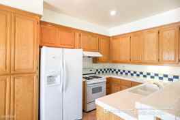 The kitchen features tiled counters with backsplash, lots of hardwood cabinetry for storage, and a complete suite of appliances perfect for preparing a hearty meal for you and your family.