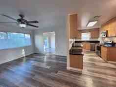 This home boasts a spacious layout with three bedrooms and two full bathrooms, perfect for comfortable living. The interior features a mix of tile and wood laminate flooring, adding a touch of elegance and durability.