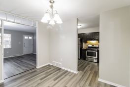 The main level opens to a bright living area featuring durable LVP flooring and fresh interior paint, creating a clean, cohesive feel throughout. Just beyond, the dining area connects seamlessly to the kitchen, which is equipped with dark cabinetry, laminate countertops, and a full appliance package. The layout allows for easy movement between spaces while maintaining defined areas for daily routines.