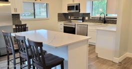 Adorable NEWLY REMODELED, contemporary single family home in super convenient Suntree location close to everything! 2 spacious bedrooms with 2 renovated full baths and large closets too! Gorgeous new sunny kitchen (with 2 windows for natural light), new white cabinetry, detached kitchen island, and new stainless appliances and new quartz counter tops and new back splash. Vaulted Great Room to make this lovely home feel even more spacious! Light and airy, neutral coastal paint color throughout! New easy maintenance, luxury vinyl flooring throughout - no carpet! Very large back patio too! This is a must see, move-in ready home. Owner may consider 1 dog with additional pet deposit.