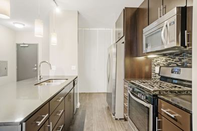 The apartment homes are exactly what you d expect, with modern, open floor plans, large kitchens, and beautiful finishes. Each unit boasts wide plank hard surface flooring, quartz countertops with mosaic backsplashes, gas stoves and