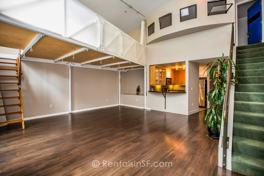 Beautiful, modern SOMA two bedroom loft . Floor-to-ceiling windows flood the unit with natural light. Dramatic high ceilings, open floor plan with spacious living area opens up to the kitchen with granite countertops and stainless steel appliances. Convenient half-bath on main level. Second level includes enclosed bedroom and en-suite bath, plus a loft with divider. Shared large roof deck with views of Downtown. This Sternberg Benjamin Designed building sits in the middle of SOMA's trendy new coffee houses, restaurants and shops , 97 Walk Score 100 Transit Score. One car parking space and laundry will be installed to the unit.