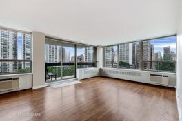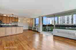 Beautifully remodeled northeast corner unit flooded with light. Wonderful city views with peeks of the lake. Split floor plan with two generous sized bedrooms and two full bathrooms. Hardwood flooring in living/dining area and new carpet in bedrooms. Gorgeous open kitchen with 42 inch cabinets and great island with storage and wine rack. Granite counters, stone backsplash. Hunter Douglas blinds. Balcony for enjoying the outdoors. No pets. Available now!