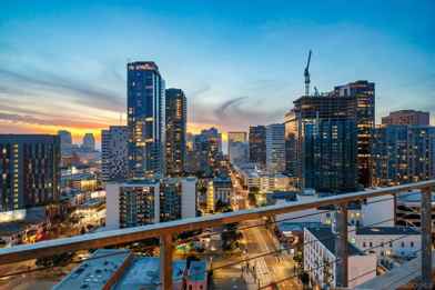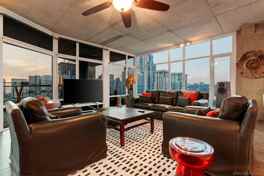 FURNISHED MIDTERM & LONG-TERM RENTAL - The Gallery Loft: Downtown's Finest Modern-industrial 2BR / 2BA high-rise condo with sweeping bay and skyline views from every room. Floor-to-ceiling windows flood the space with natural light, while curated art and sculptural pieces give a gallery-style sophistication. Spacious terrace and private lanai offer front-row seats to San Diego's iconic sunsets and city lights. Open-concept layout includes a sleek kitchen with high-end appliances, indoor/outdoor dining spaces, and comfortable living area ideal for entertaining or unwinding. Primary suite features en-suite bath and direct terrace access; second bedroom offers equally stunning views. Building amenities include a rooftop jacuzzi, lounge seating, and panoramic views of downtown and the bay. Unit includes A/C, in-unit laundry, and secure on-site parking. Located in the heart of East Village-steps to world-class dining, rooftop bars, galleries, shops, Petco Park, and the Gaslamp Quarter-with easy trolley access throughout the city. Sleeping Setup (max 4): BR1 Queen - BR2 Queen - 2 Full Baths Minimum 30-day stay. Monthly rates vary by lease length; please inquire for an exact quote. Rates reflect short-term rental pricing and vary by season and duration. Published amounts are estimates; final pricing, fees, and availability are subject to change until a signed agreement.