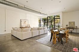 An architectural live-work loft designed by acclaimed architects Pugh + Scarpa, offering volume, character, and a modern sensibility. This ground-floor 1-bed, 2-bath residence blends industrial materials with a warm, organic palette, creating a refined setting for both living and working. The main great room opens in a dramatic sweep, with polished concrete floors, high ceilings, exposed steel, and an expansive wall of glass that frames mature greenery and soft, filtered light. Living, dining, and kitchen areas integrate seamlessly to create a multifunctional environment for everyday life, hosting, or creative work. The kitchen is efficient and well-composed, featuring stainless steel appliances, open shelving, and thoughtful storage. An east-facing patio sits just outside of the front door, extending the living space. The bedroom suite feels loft-inspired, with an operable garage-style door that introduces natural light and adds a distinctive architectural detail. The ensuite bath includes dual sinks, abundant storage, and a spacious walk-in shower. A second full bath adds guest-friendly convenience. Additional features include in-unit laundry, a storage room, and two side-by-side parking spaces with guest parking. Close to shops, dining, and the beach, this loft offers a relaxed, design-forward lifestyle with convenient access to the best of the Westside.