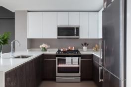 This elegant north-facing three-bedroom residence features an in-unit washer/dryer, white desert oak flooring, floor-to-ceiling windows, solar shades, LED lighting and more. The kitchen includes a gas range, dishwasher, custom cabinetry, under cabinet lighting and Ceasarstone counters, while the bathroom offers a tri-view mirror with storage and custom European vanity.