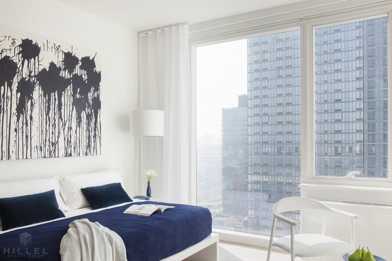 This elegant studio residence offers west and south-facing views overlooking the park and features an in-unit washer/dryer, white desert oak flooring, floor-to-ceiling windows, solar shades, LED lighting and more. The kitchen includes a gas range, dishwasher, custom cabinetry, under cabinet lighting and Ceasarstone counters, while the bathroom offers a tri-view mirror with storage and custom European vanity.