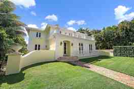 This beautiful, 2-story Bermuda style home offers a wonderful floor plan with 5 bedrooms and 7 bathrooms. It features marble and wood floors, a custom cypress paneled library, separate dining room, a heated pool, and covered patio. Additional amenities include an elevator, generator, fireplace, up and down-stairs laundry rooms, top of the line appliances and much more. This home offers a serene and sophisticated retreat perfectly balancing privacy with convenience. Great location with the beach, bike trail and mid-town shopping area just moments away.