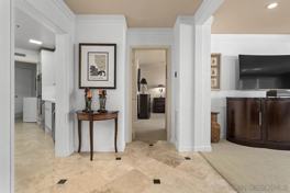 The classic elegance that infuses the entirety of the iconic Meridian building is especially apparent in this extra-spacious one-bedroom, one-and-a-half-bathroom unit. Rich, dark wooden hues and decadent upholstery with a chic safari flare characterize this upscale space that benefits from high ceilings and enchanting city views. The primary bedroom suite boasts a California king-size bed, a full wall of closet space with two double-door mirrored closets, and custom-built-in shelving. A robust desk is thoughtfully positioned in front of large windows providing ample natural light, perfect for those looking to work from home. The luxurious ensuite bathroom is finished in gleaming marble, and includes a spa bathtub, freestanding shower, double sink vanity, and a separate space with a toilet and bidet. Other perks include a powder bathroom in the entry area, ideal for guests, and ample storage throughout the unit-with built-in cabinets in the living room and a large pantry in the laundry room. Within the Meridian building in the heart of the Marina District! This locale offers a perfect dose of urban appeal and access to recreational areas, just minutes from the San Diego Convention Center, Seaport Village, The Embarcadero, The New Children's Museum and the Gaslamp Quarter-areas rife with spots to peruse boutique shops or to grab a tasty bite and brew. The close by Martin Luther King Jr. Promenade offers a superbly landscaped linear park that is a favorite for pedestrians, joggers, dog walkers and families alike, as the Children's Park is located along the promenade.