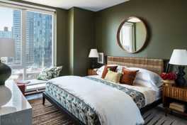 This elegant north-facing one-bedroom residence features an in-unit washer/dryer, white desert oak flooring, floor-to-ceiling windows, solar shades, LED lighting and more. The kitchen includes a gas range, dishwasher, custom cabinetry, under cabinet lighting and Ceasarstone counters, while the bathroom offers a tri-view mirror with storage and custom European vanity.