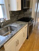 Granite countertops and stylish tile backsplash