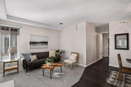 The living room enjoys a cozy fireplace with a stunning repurposed wood accent wall. The kitchen features granite counters, stainless steel appliances, and a pass-through window to the dining area. The primary bedroom enjoys a private balcony and a double vanity with custom mirrors and lighting.