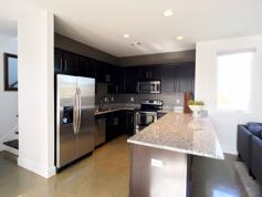 This unit has the option to be furnished with bed frames and mattresses, kitchen barstools, a couch, a coffee table, and one bedside table for each room.