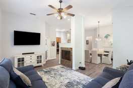 Inside, you’ll find a spacious kitchen with stainless steel appliances, a large center island, and plenty of cabinet space — perfect for cooking or entertaining. The dining area and living room each feature their own fireplace, creating an inviting atmosphere. The primary suite includes a generous walk-in closet with built-ins and a spa-style bath with double sinks, soaking tub, and glass-enclosed shower. Two additional bedrooms, a hall bath, and a separate laundry room add comfort and convenience.