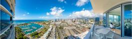 Discover exceptional luxury in this furnished 28th-floor corner unit at Waiea in Kaka‘ako, Honolulu. Spanning 1,447 sq. ft. of thoughtfully designed living space, this residence also features a 159 sq. ft. covered lanai and a 63 sq. ft. uncovered lanai, offering breathtaking views of Kewalo Harbor, the city skyline, and the lush mountains beyond.