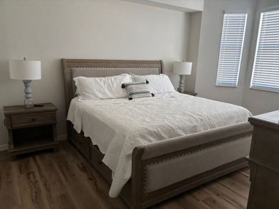 Recent upgrades enhance the home throughout, including new flooring and fresh paint in both bedrooms, and new paint in both bathrooms. The primary bathroom has been fully refreshed with a new countertop, cabinet, and shower door, while the guest bathroom features new cabinetry and a new mirror. Additional highlights include tile flooring in the main living areas, crown molding, plantation shutters, and stainless steel appliances, creating a refined yet inviting atmosphere.