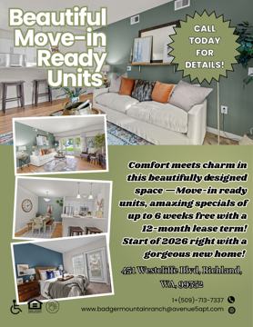 Nestled in a great South Richland neighborhood, Badger Mountain Ranch offers brand new one-, two- and three-bedroom apartments for rent. Enjoy an array of amenities including a theatre room, a shimmering pool and an invigorating spa where the serene setting, coupled with an awesome mountain view, will whisk you away. Part of the Richland School District, the community offers a prestigious Westcliffe address off of Keene Road in the Badger Mountain Village area. You will be proud to invite guests to your luxurious apartment home where style is at its finest.